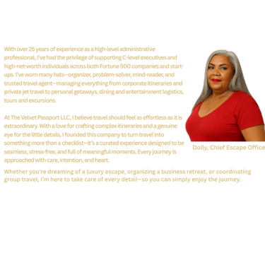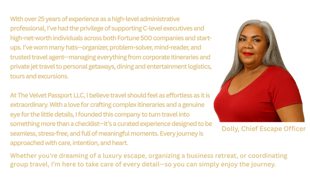 My experience with The Velvet Passport LLC was incredible. Dolly provided true concierge-style service, handling every detail so I could fully relax and enjoy my trip. The itinerary was fun, thoughtful, and perfectly tailored to my style. It felt like traveling with a personal planner by my side. I can’t wait to book again!